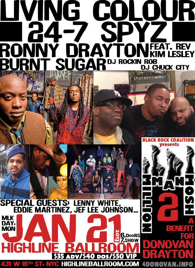 Will Calhoun's Native Lands Trio at Brooklyn Academy of Music Performance begins at 11:00pm Free Featuring: Brooklyn Academy of Music Check out the BAM Website for additional details and to confirm times. Monday, January 21, 2013 Million Man Mosh II: A Benefit for Donovan Drayton,' ft. Living Colour, 24-7 Spyz, Ronny Drayton + more The Black Rock Coalition proudly presents' The Million Man Mosh II: A Benefit for Donovan Drayton' at The Highline Ballroom in New York City. The show will reunite two of the city's most renowned Black rock bands in a rare joint stage appearance: Grammy-Award winning rock band Living Colour and funk-metal-soul pioneers 24-7 Spyz. Legendary guitarist Ronny Drayton will perform with an all-star cast of musicians. Proceeds for the event will go to the legal defense of Donovan Drayton, son of Ronny, who was recently released on bail after serving five years in Riker's Island without a conviction. Doors open at 6PM, show time is at 7PM Tickets are $35 advance, $40 day of show, $50 VIP seating and backstage meet and greet. Highline Ballroom Check out the Highline Ballroom Website or call (212) 414-5994 for additional details and to confirm times. Saturday, January 19th, 2013 Will with Doug Wimbish at WimBash>>Miami Beach 2013 Will performs with the Doug Wimbish Sound System as part of WimBash>>Miami Beach 2013, hosted by Art Deco Weekend/Miami Design Preservation League. Performance begins at 10pm 11th Street Stage Check out the Art Deco Weekend Festival and Doug Wimbish Facebook calendar pages for more information. Friday, January 11th, 2013 Will Calhoun's E=MC2 trio at The Bitter End As part of the 2013 NYC Winter Jazzfest, Will Calhoun's E=MC2 trio will play at The Bitter End. Performance begins at 12:30am (early morning on Saturday, January 12) Featuring: The Bitter End Check out The Bitter End Website or call (212) 673-7030 for additional details and to confirm times. Friday, January 11th, 2013 Will performs at Le Poisson Rouge for 2013 NYC Winter Jazzfest Performance begins at 11pm Le Poisson Rouge Check out the Le Poisson Rouge Website or call (212) 505-3474 for additional details and to confirm times. Friday, January 11th, 2013 Will performs with Global Noize in Sly Reimagined, the music of Sly and the Family Stone Doors open at 9pm, show begins at 9:30pm Drom Check out the Drom Website or call (212) 777-1157 for additional details and to confirm times. Will Calhoun's Native Lands Trio at Zinc Bar The Will Calhoun Trio plays at the Zinc Bar as part of the 2013 NYC Winter Jazzfest and Jazz Connect Conference Set times are 9:45 and 11:00pm Cover is $15, free for attendees at the Jazz Connect Conference Featuring: Zinc Bar Check out the Zinc Bar Website or call (212) 477-9462 for additional details and to confirm times. Private Drum Lessons with Will Calhoun