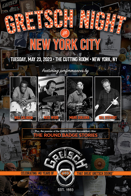 Tickets: $20 for adults, $15 for Seniors, and $10 for students, with a special 10% discount for BRAC members and registered students in the BRAC Education program, Live Streaming on YouTube: $5.00. Bronx River Art Center For additional information, please visit the Bronx River Sounds 2023 Web page, or view the Bronx River Sounds 2023 Poster (pdf.) ![]() Tuesday, May 23, 2023 Gretsch Night with Will and other Drummers in NYC A special one-night-only event to celebrate 140 years of Gretsch Drums history, featuring performances by revered drummers Will Calhoun, Nate Wood, Mark Guiliana, Bill Stewart, and special guests. In addition, watch the premier of the Gretsch Drummer documentary film: The Round Badge Stories. Time: 7 - 9PM, Doors open at 6PM